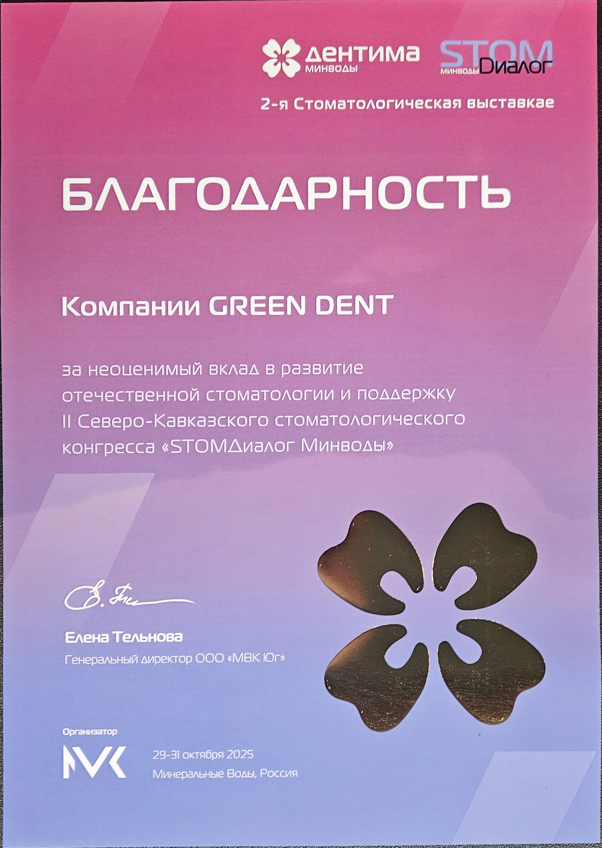 Благодарность компании GREEN DENT