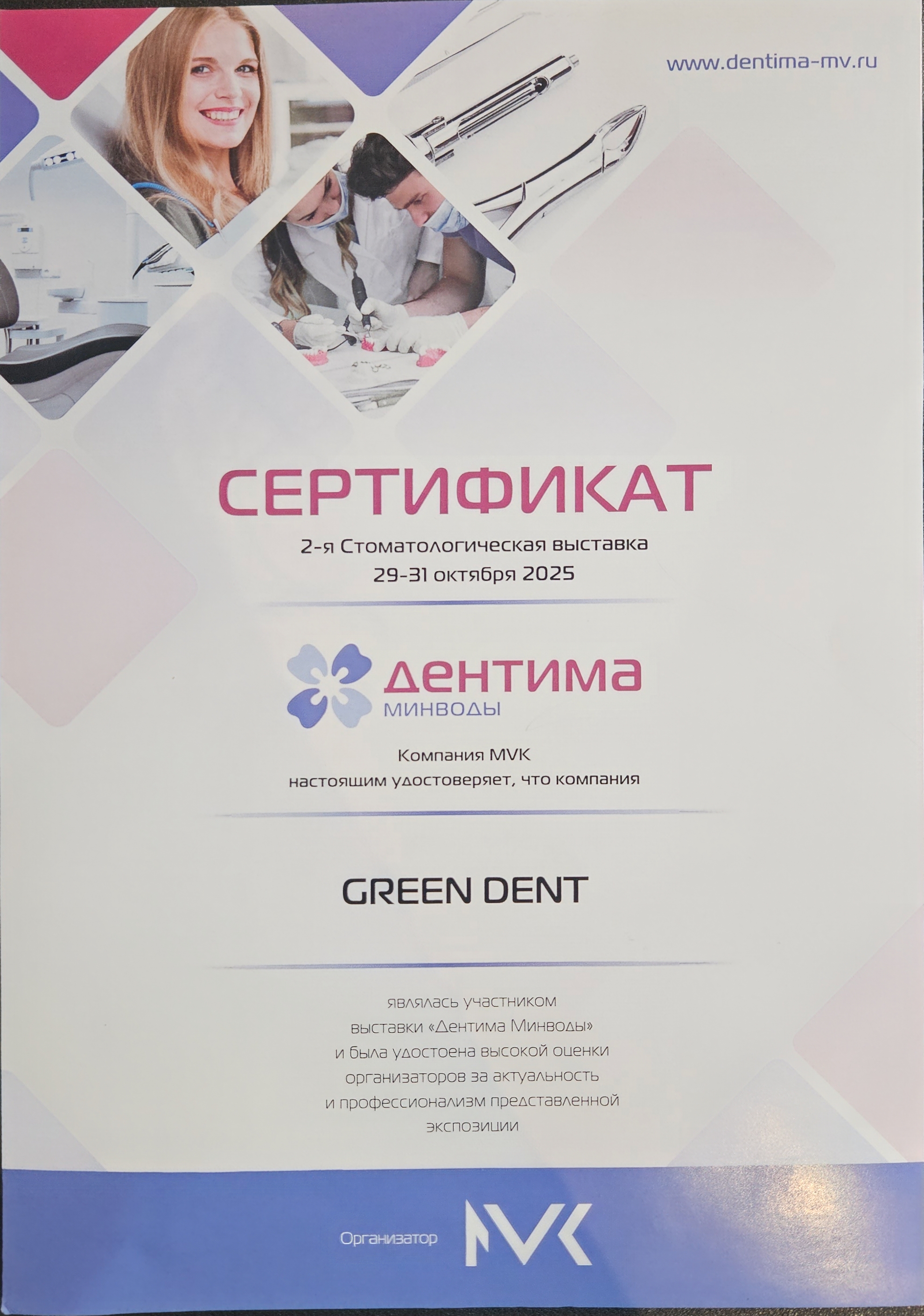 Компания MVK настоящим удостоверяет, что компания GREEN DENT являлась участником выставки «Дентима Краснодар» и была удостоена высокой оценки организатора за актуальность и профессионализм представленной экспозиции.
